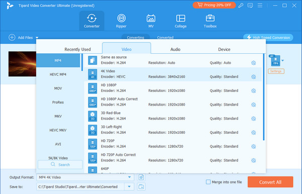Tipard Video Converter Ultimate is a superior multimedia file converter tool and a 4K resolution video converter that can help you convert multimedia files into newer formats. It is also very adaptable for its interfaces on every device and platform. Besides format conversion, this versatile software can enhance your videos by upping their quality to 4K resolution, including top-notch visuals and captivating details from any footage you mine! But this app can handle it if you want to convert 4K to 1080p.
